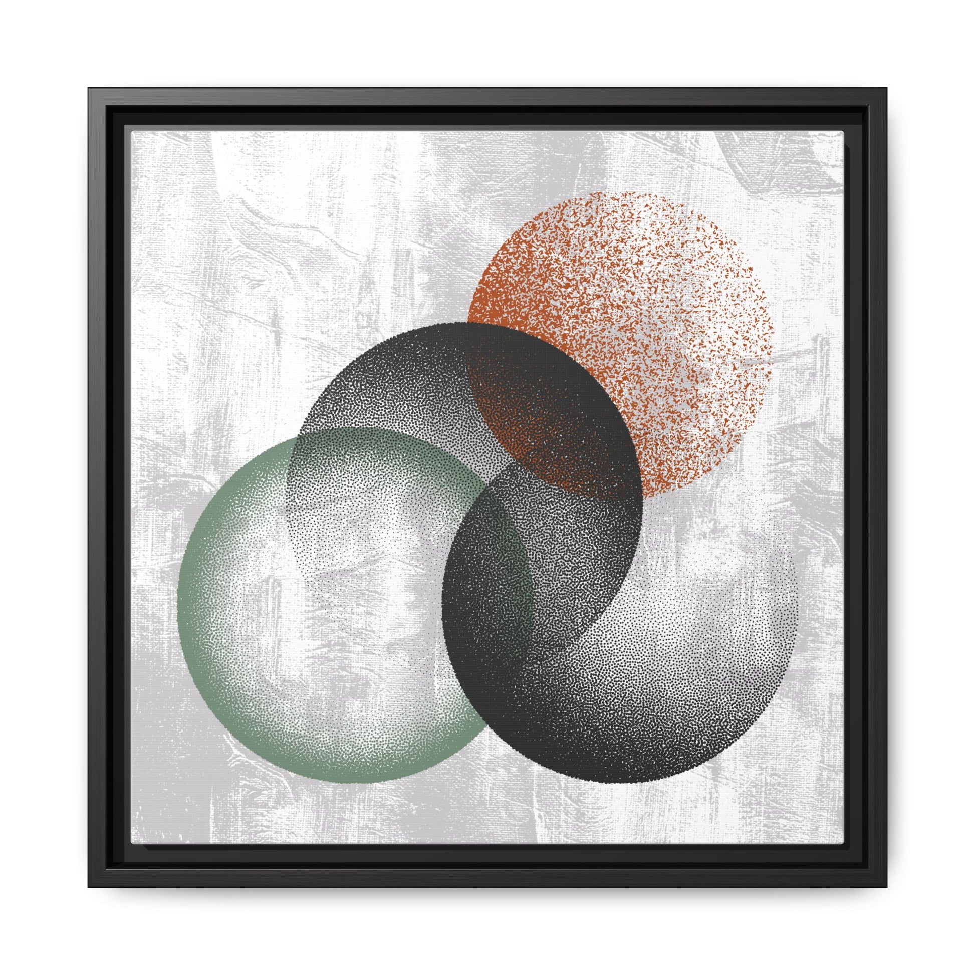 Float this matte canvas into a calm, modern room and let its layered circles start conversations. Soft greens, warm terracotta, and charcoal grays drift over a textured neutral ground, creating depth without shouting. The slim black frame gives the piece a gallery-ready presence while keeping the focus on the subtle gradients and grainy overlays. Hang it above a console, pair it with natural wood furniture, or let it anchor a monochrome gallery wall — it brings a quiet, artful pulse to spaces that favor considered design and visual balance.