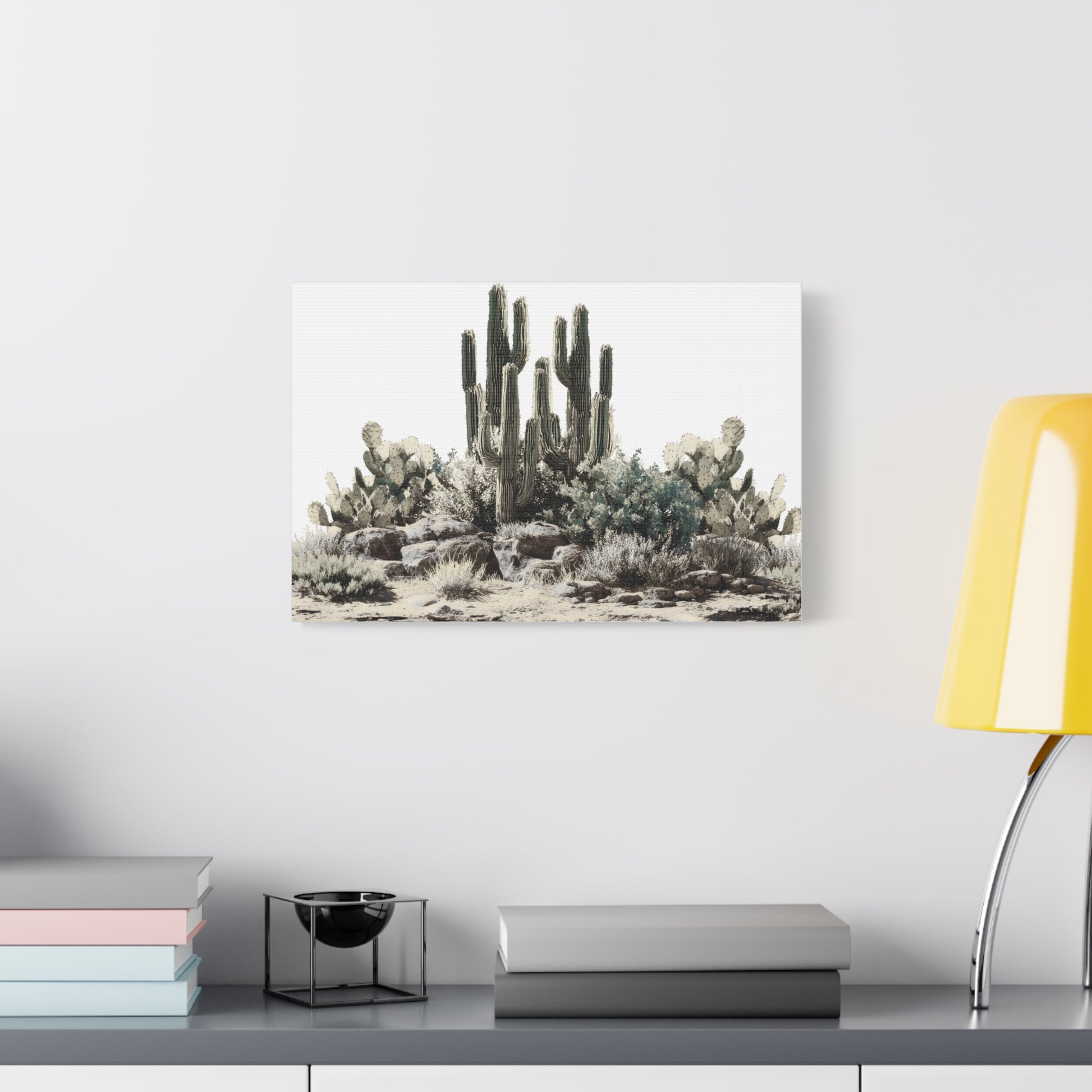 Sun-warmed stone and quiet green silhouettes — this stretched matte canvas brings a small desert outpost into your room. A cluster of varied cacti perches on textured rock, each spine and shadow captured with soft, natural tones that soothe rather than shout. Hang it above a low console, lean it against a bookshelf, or let it anchor a reading nook; it reads like a pause in the day, the kind of calm you return to after errands or a long drive. The understated matte finish keeps glare away and invites a close look at the subtle details of the rocks and plants. For anyone who collects quiet landscapes, loves southwestern motifs, or wants a gentle reminder of resilience and slow growth, this canvas fits naturally into everyday spaces and seasonal refreshes like spring transitions or a summer redecorating moment.