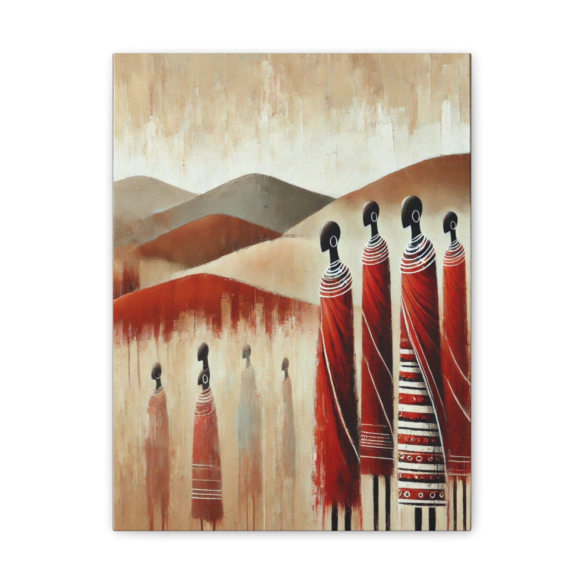 This canvas print features East African Masai women in their colorful garments against a backdrop of hills. Perfect for adding a touch of cultural flair to any room, this piece is ideal for art enthusiasts and those with a love for African cultures. Great for celebrating diversity and multiculturalism.