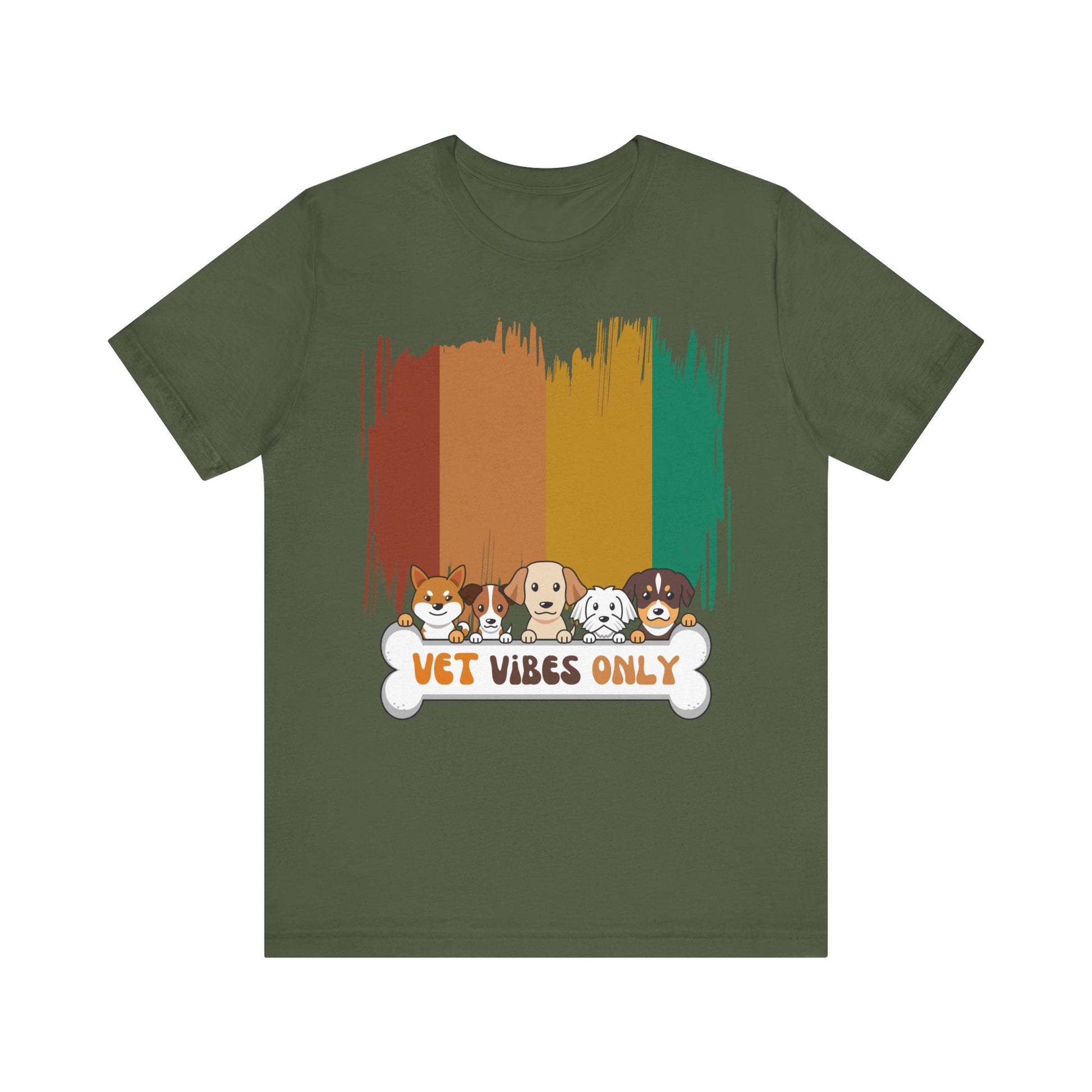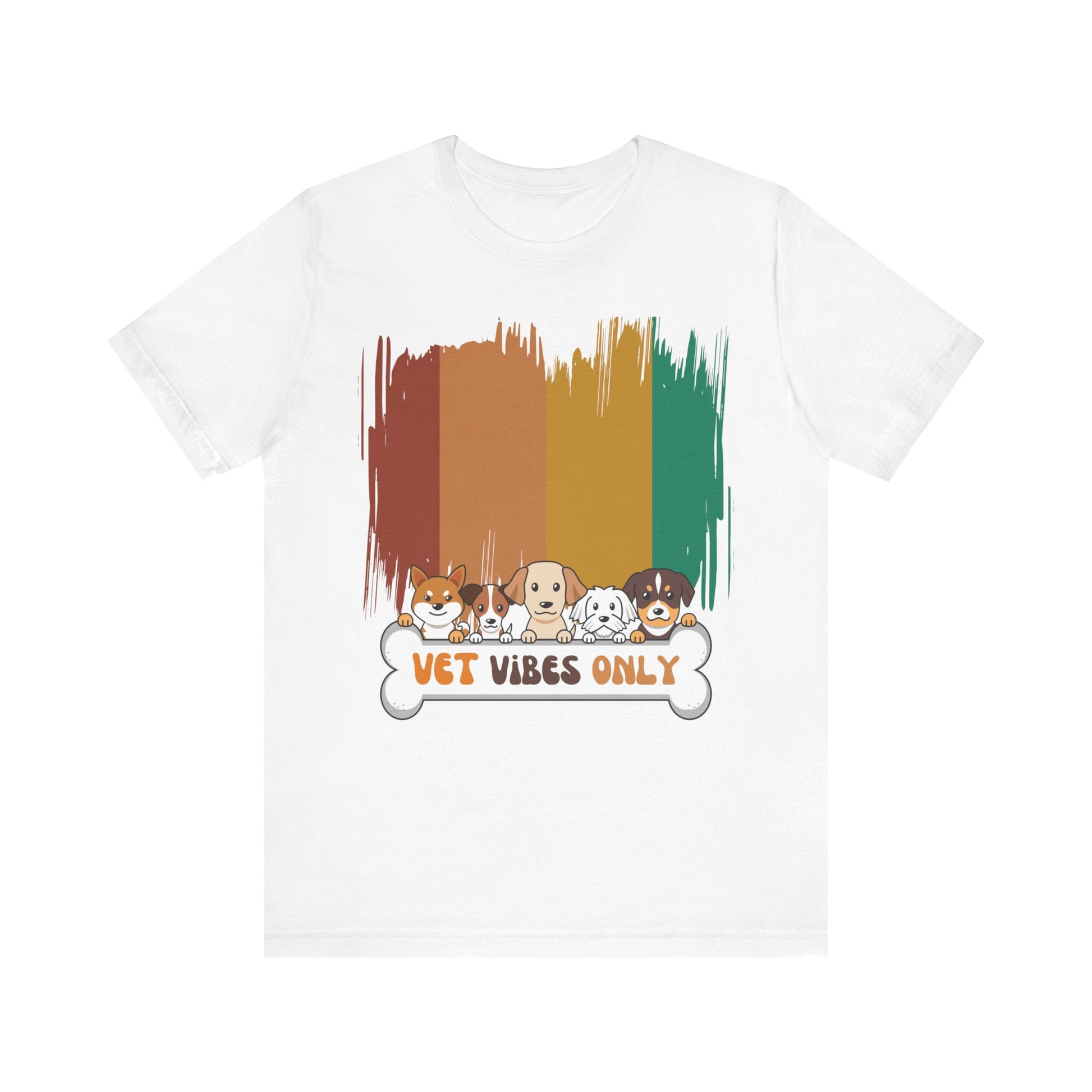 A unisex jersey short sleeve t-shirt featuring a graphic of household pets with the phrase 'Vet Vibes Only'. Perfect for animal lovers and those in the veterinary field. Ideal for casual wear or as a gift for pet owners on special occasions like National Pet Day or World Veterinary Day.