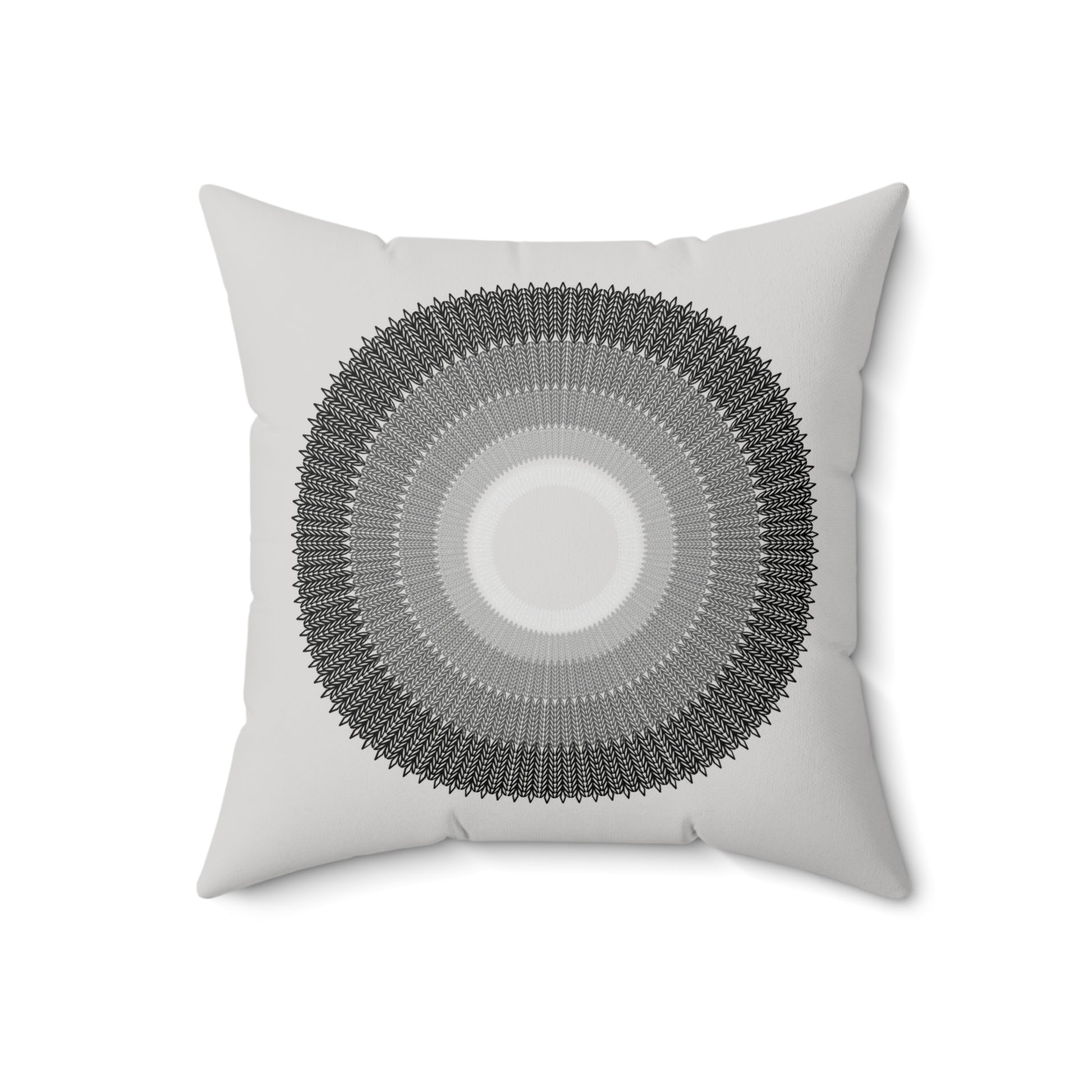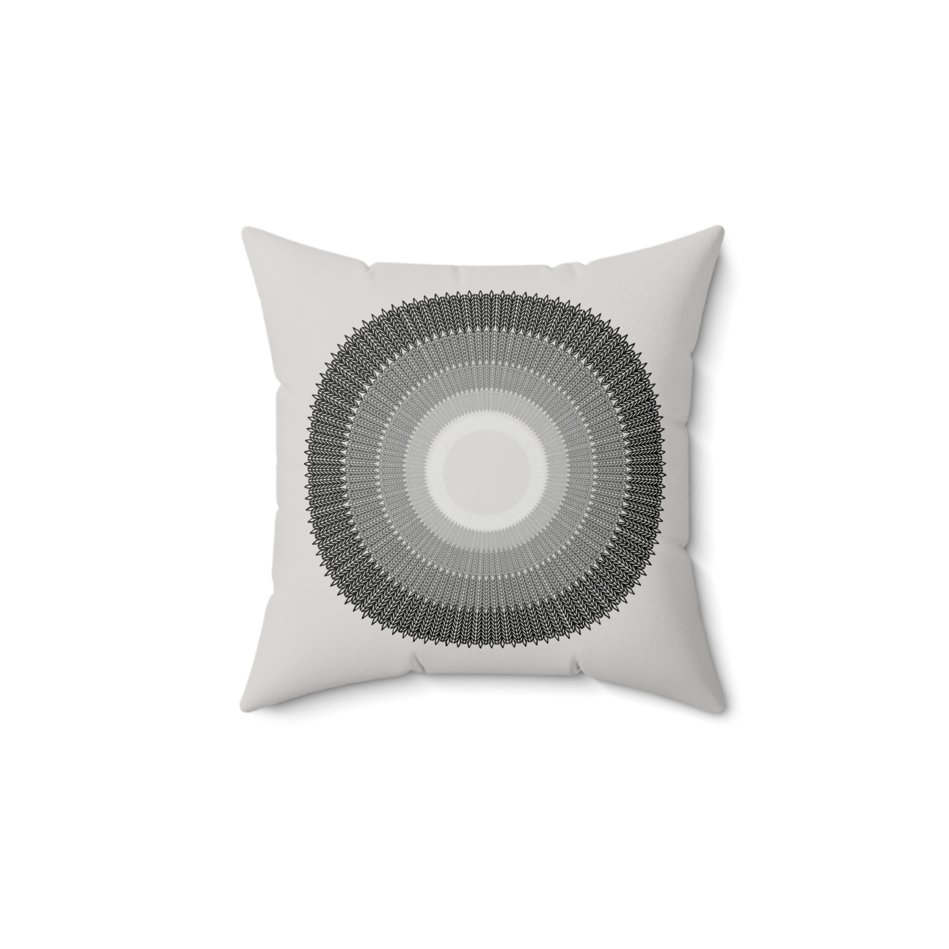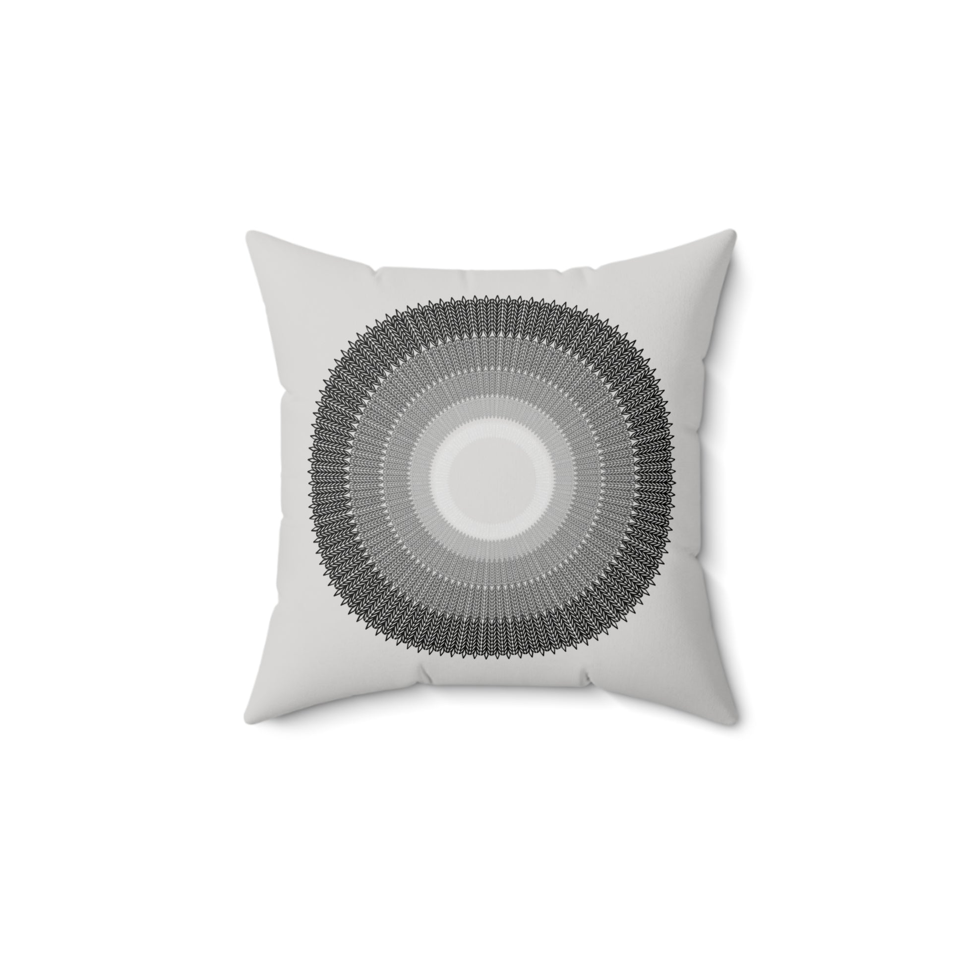 A luxurious spun polyester square pillow featuring a unique design of circles arranged from smallest to largest, with colors fading from light grey to black. This pillow is perfect for adding an elegant touch to your home decor and creating a cozy atmosphere. Ideal for those who appreciate modern and minimalist design and suitable for occasions like housewarmings or birthdays.