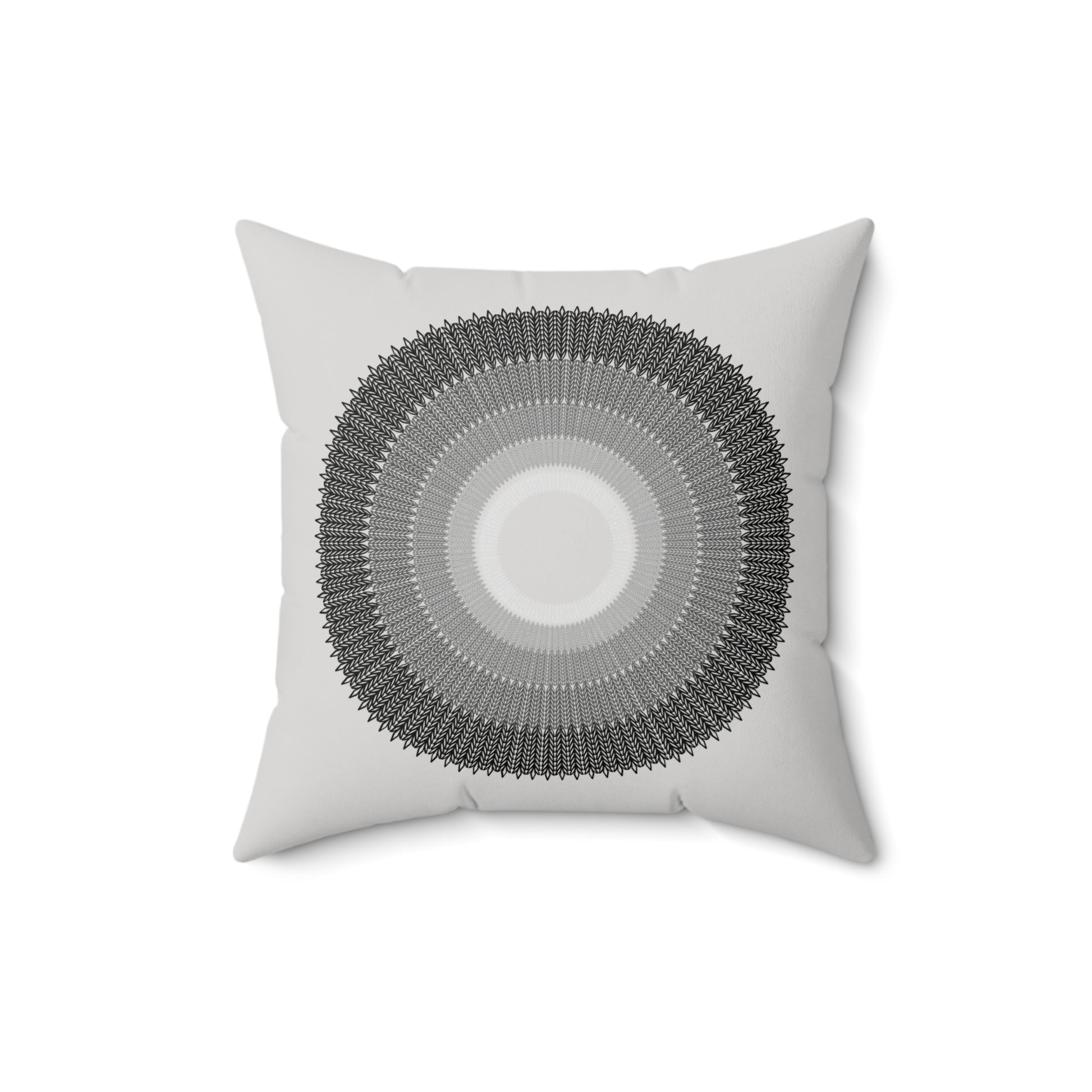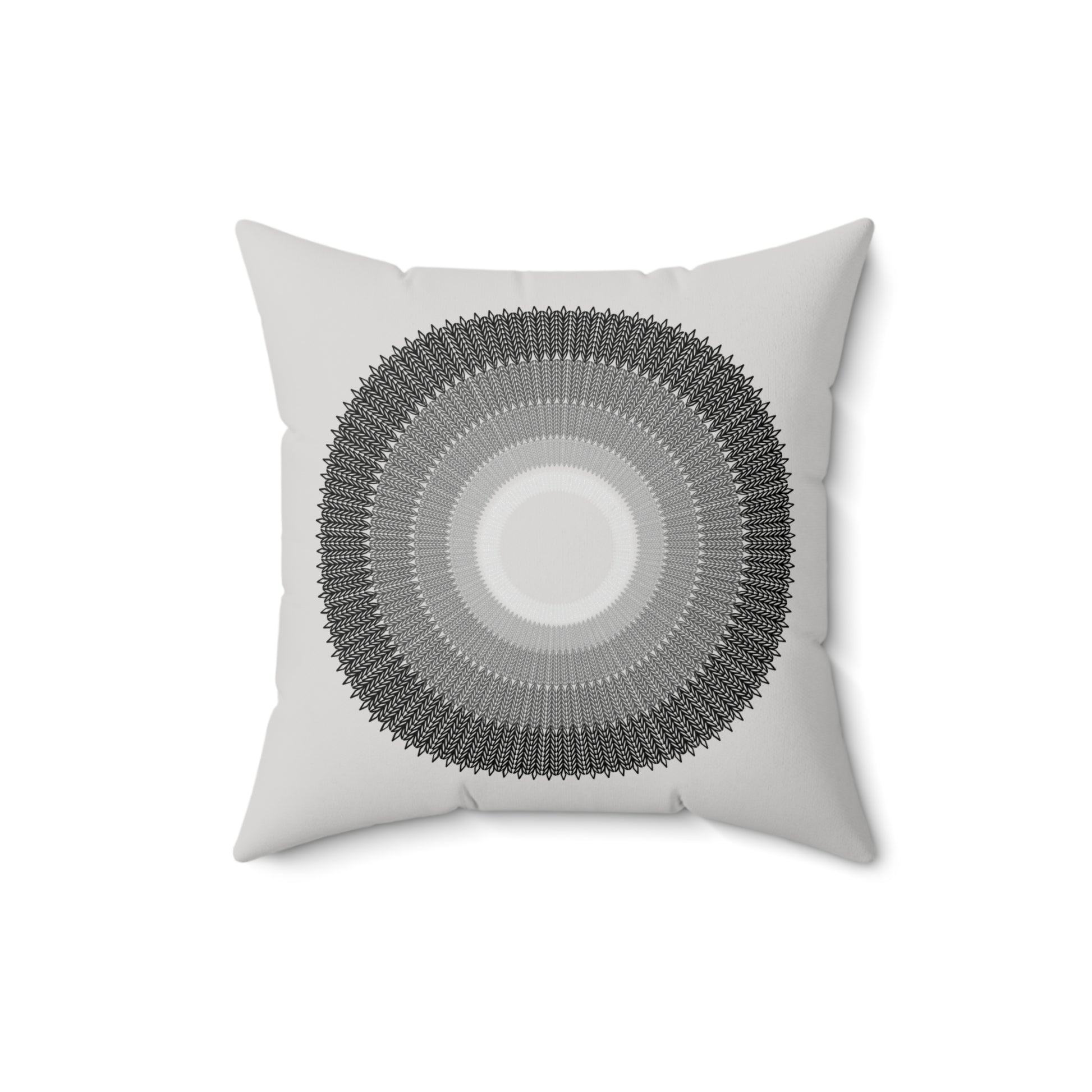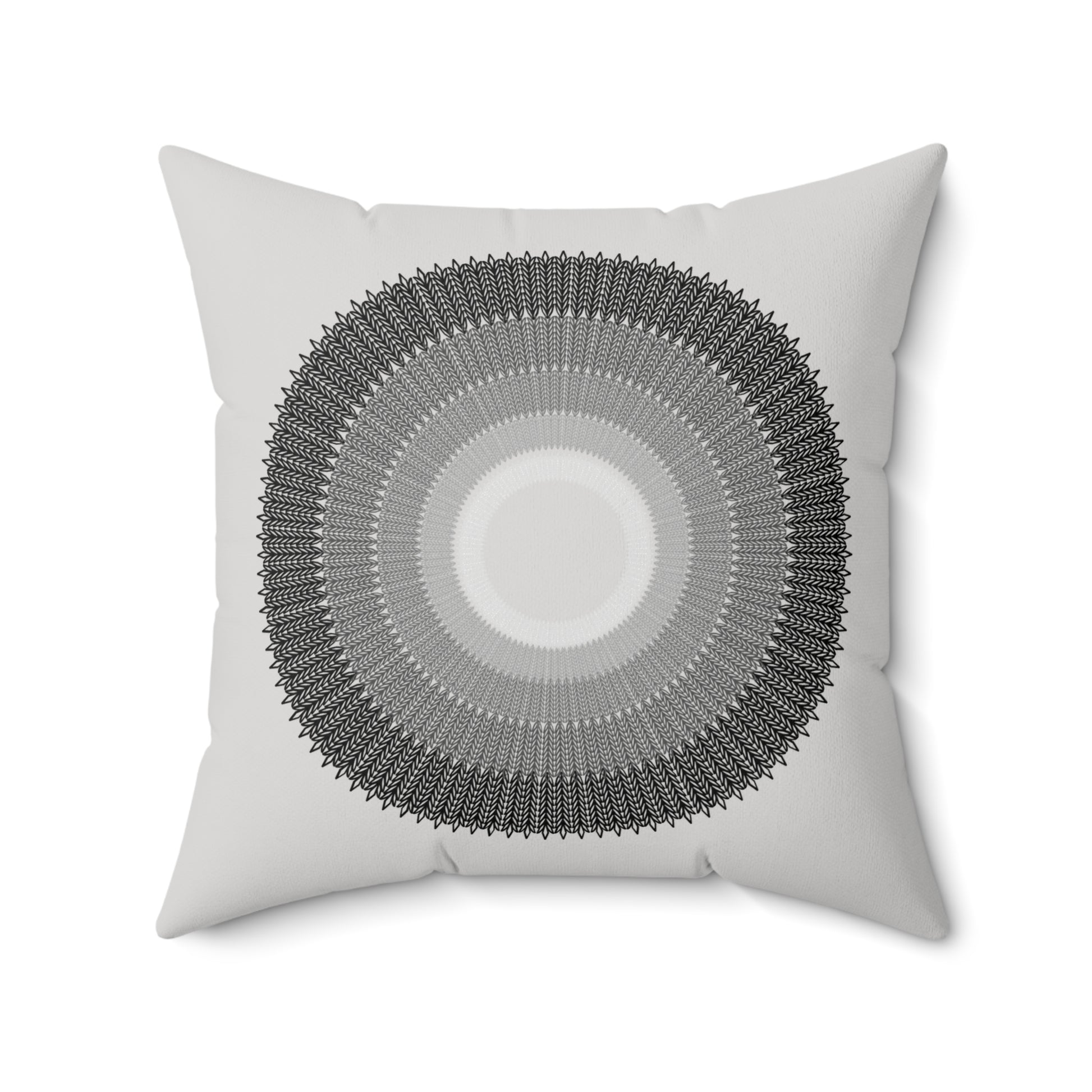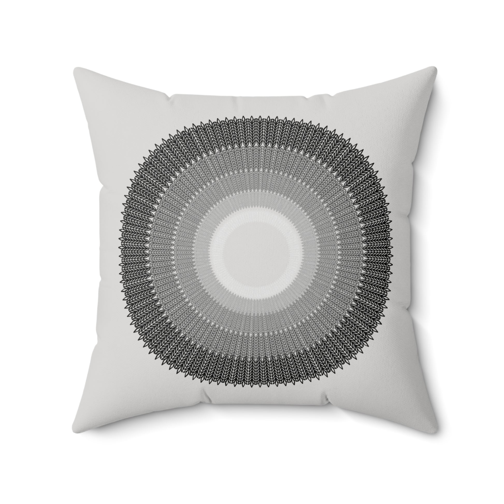 A luxurious spun polyester square pillow featuring a unique design of circles arranged from smallest to largest, with colors fading from light grey to black. This pillow is perfect for adding an elegant touch to your home decor and creating a cozy atmosphere. Ideal for those who appreciate modern and minimalist design and suitable for occasions like housewarmings or birthdays.